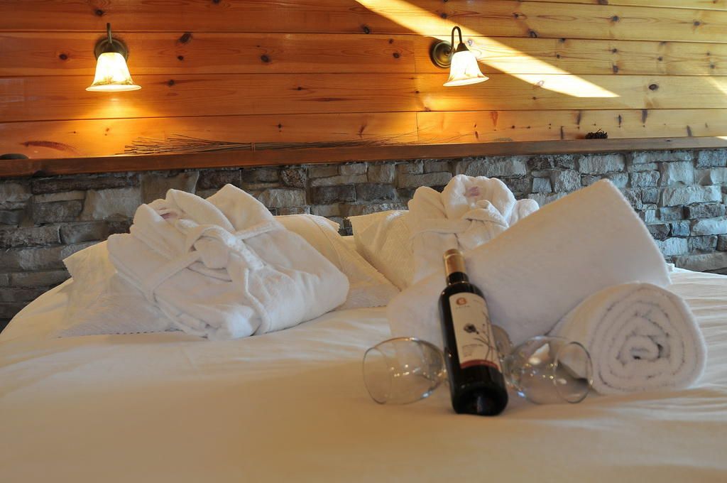 קמין גז מעוצב אשר נראה לחלוטין כקמין עצים וגרם לי לבלבול משעשע. ג'קוזי זוגי בצורה אובאלית א-סימטרית שוכן בנישה נפרדת בסמוך לחלון לנוף, כמובן. מסך LCD מתכוונן מגיע לכל פינה בבקתה, ומלווה במערכת קולנוע איכותית. ארון הבגדים הנמצא בכניסה מציע מקומות אחסון רבים, כולל שטח לתליית בגדים.